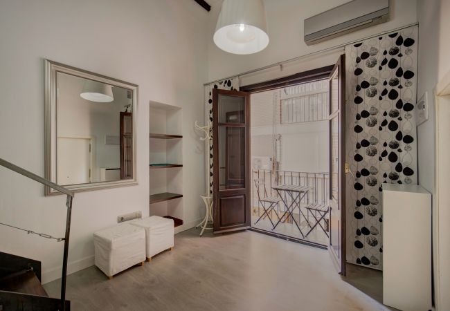 Nada más entrar, a mano derecha, se encuentra una moderna cocina abierta al salón que dispone de todos los electrodomésticos y utensilios necesarios para cocinar. El salón-comedor, rodeado de balcones, disfruta de mucha luz natural y está equipado con un sofá cama (140cm x 190cm), TV y una mesa de comedor moderna con sitio suficiente para sentarse y comer cómodamente.
